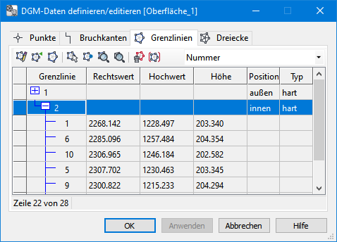 - Option Nummer (Bezeichnung) - Für jede Bruchkante werden die zugehörigen Punkte in Form der Punktnummer und der Punktbezeichnung dargestellt. Die Punktbezeichnung des jeweiligen Punktes wird dabei in Klammern angezeigt.