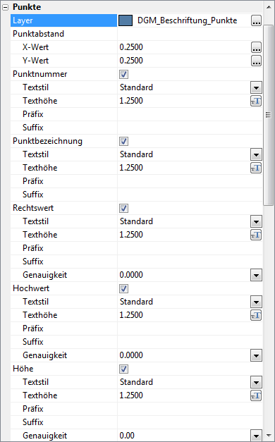 DGM-Punktbeschriftungen können für die Ausgabe von Textinformationen an jedem einzelnen Geländepunkt verwendet werden. Für die DGM-Punktbeschriftungen können der Layer, der Textstil, die Texthöhe, die Genauigkeit und der Beschriftungsabstand vom jeweiligen Punkt festgelegt werden.