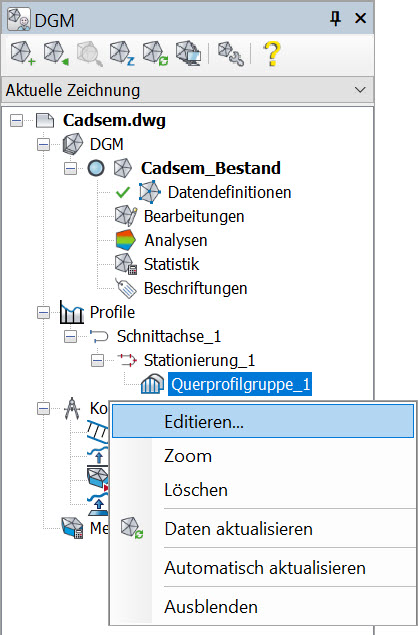 Das Editieren einer Querprofilgruppe erfolgt über den gleichen Dialog wie beim Erstellen einer Querprofilgruppe. Die Editierfunktion wird über das Kontextmenü der gewählten Querprofilgruppe im Projektbrowser zur Verfügung gestellt. Es können alle Werte, die auch für die Erstellung von Querprofilen zur Verfügung stehen, modifiziert werden.