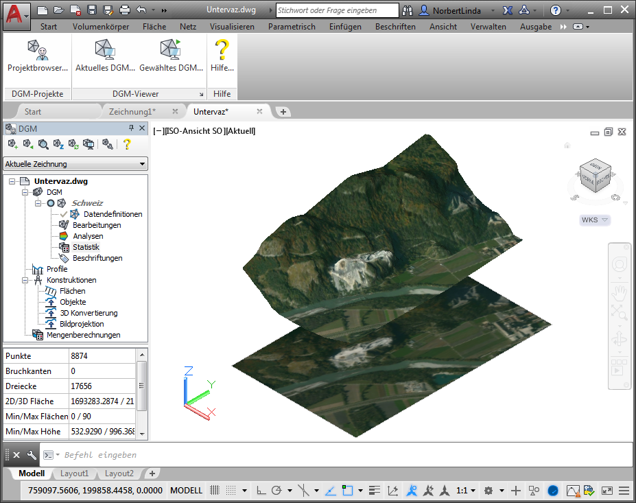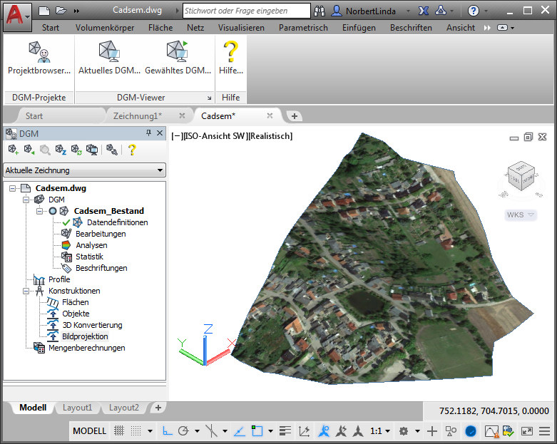 Ein projiziertes Pixelbild kann nur in einem realistischen Visuellen Stil angezeigt werden oder in einem Benutzerdefinierten Stil, welcher einen realistischen Flächenstil aufweist. Wenn Sie diese Option aktiviert haben, setzt das DGM nach der Projektion den realistischen Stil aktuell und zoomt gleichzeitig auf eine isometrische Ansicht des Ergebnis-Objektes.