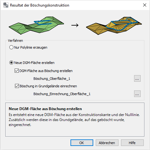 Durch Anklicken der gepunkteten Schaltfläche […] erscheint der Dialog Resultat der Böschungskonstruktion, in welchem geregelt wird, ob das Ergebnis der Konstruktion lediglich als Polylinie zur weiteren Verwendung dargestellt wird oder ob neue DGM-Flächen aus den Objekten der Böschung erstellt werden. Für diese Einstellungen wird jeweils ein Beispiel dargestellt, um das Prinzip zu veranschaulichen. Gleichzeitig erfolgt eine Erklärung des Verfahrens im unteren Dialogbereich. Nach Bestätigung mit OK wird das gewünschte Resultat in den Hauptdialog der Böschungskonstruktion eingeblendet. Folgende Optionen stehen für das Resultat zur Verfügung: |