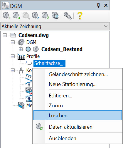 Das Löschen einer Schnittachse sollte immer durch Auswahl des betreffenden Elementes im Projektbrowser erfolgen. Die Funktion Löschen steht dabei nur im Kontextmenü zur Verfügung. Hinweis: Das Löschen einer Schnittachse führt ebenfalls zum Entfernen aller referenzierten Elemente! Wenn also Geländeschnitte, Stationierungen, Gradiente sowie Längs- und Querprofile auf deren Basis erstellt wurden, werden diese auch automatisch aus der Zeichnung und dem Projektbrowser gelöscht! |