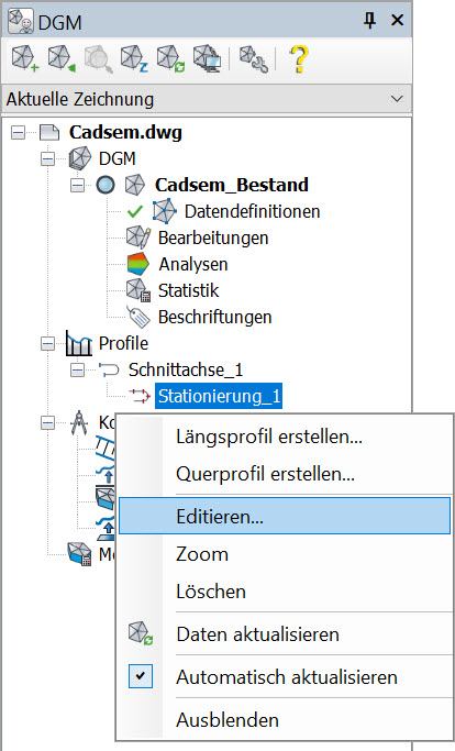 Hinweis: Wenn Sie Stationierungen mit CAD-Funktionen bearbeiten, werden diese Änderungen bei Aktualisierung der Stationierungsgruppe rückgängig gemacht und nicht berücksichtigt!