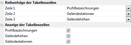 Diese Option steuert die Ausgabe und Darstellung der Tabellenzeilen im Längsprofil. Die Reihenfolge der Tabellenzeilen lassen sich dabei global festlegen. Die Anzeige der gewünschten Tabellenzeilen erfolgt durch aktivieren der entsprechenden Optionsschaltfläche im Bereich Anzeige der Tabellenzeilen.