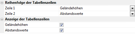 Diese Option steuert die Ausgabe und Darstellung der Tabellenzeilen im Querprofil. Die Reihenfolge der Tabellenzeilen lassen sich dabei global festlegen. Die Anzeige der gewünschten Tabellenzeilen erfolgt durch aktivieren der entsprechenden Optionsschaltfläche im Bereich Anzeige der Tabellenzeilen.