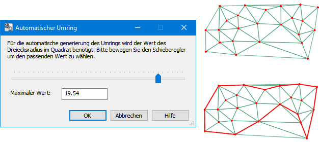 Dieser Befehl dient zur automatischen Bestimmung von Grenzlinien in der Zeichnung. Für die Bestimmung wird ein Dreiecksradius ermittelt, welchem die betreffenden Dreiecke genügen. Dieser Wert kann entweder direkt oder über den Schieberegler im Dialogfeld bestimmt werden. Zu jedem definierten Wert wird direkt das Ergebnis der Berechnung innerhalb der Zeichnung angezeigt. Sollte das Ergebnis nicht sichtbar sein, so prüfen Sie bitte die Eigenschaften der aktuellen Oberfläche (Komponente Grenzlinien).