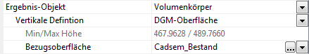 Die Unter- bzw. Oberseite des Volumenkörpers wird durch eine gleichmäßige Bezugshöhe definiert, wodurch sich ein flacher Boden oder Deckel ergibt. Die Funktion ermittelt hierbei den Höhenbereich der gewählten DGM-Oberfläche bzw. der 3D-Flächen und schlägt eine auf ganze Meter gerundete Bezugshöhe vor.