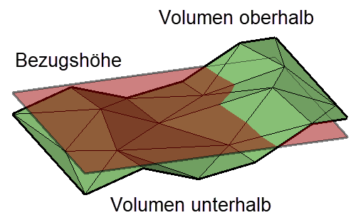 Liegt die Bezugshöhe allerdings innerhalb des vorhandenen Höhenbereichs, wird die Oberfläche geschnitten. Es ist dann zu entscheiden, ob der Volumenkörper oberhalb oder unterhalb der Bezugshöhe erstellt werden soll. |