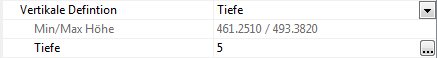 Die Tiefe wird senkrecht zum DGM angewendet. Bei Eingabe eines positiven Wertes wird die Fläche nach oben extrudiert und bei einem negativen Wert nach unten. Durch Betätigung der gepunkteten Schaltfläche [...] lässt sich der Wert auch durch Zeigen einer Strecke in der Zeichnung definieren. |
