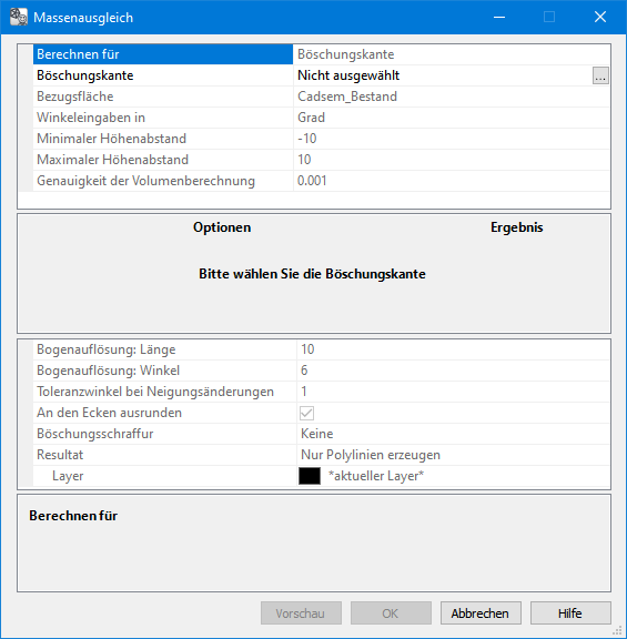 Beim Aufruf des Massenausgleichs erscheint der gleichnamige Dialog, welcher Sie Schritt für Schritt durch die weitere Vorgehensweise leitet. Da die Auswahl einer Böschungskante oder einer bestehenden Oberfläche, von der aus ein Massenausgleich erstellt werden soll, die erste Voraussetzung darstellt, sind zunächst alle Dialogzeilen bis auf die Auswahl der Böschungskante ausgegraut. Für die Auswahl DGM-Fläche sind mindestens zwei definierte Oberflächen erforderlich. Durch Anklicken der gepunkteten Schaltfläche […] werden Sie gebeten, die Elemente in der Zeichnung zu wählen. Erlaubte Objekte für eine Böschungskante sind hierbei 2D-/3D-Polylinien, LW-Polylinien, Kreise sowie Linien und Bögen. Bei der ausgewählten Böschungskante muss es sich immer um ein geschlossenes Objekt handeln! |