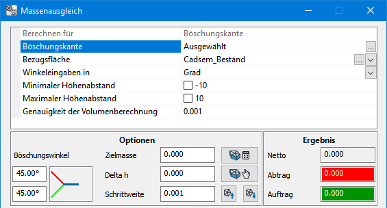 Nach Auswahl der Böschungskante erfolgt im nächsten Schritt die Wahl der betreffenden Bezugsfläche, worauf Böschungen sowie die resultierenden Massen berechnet werden.