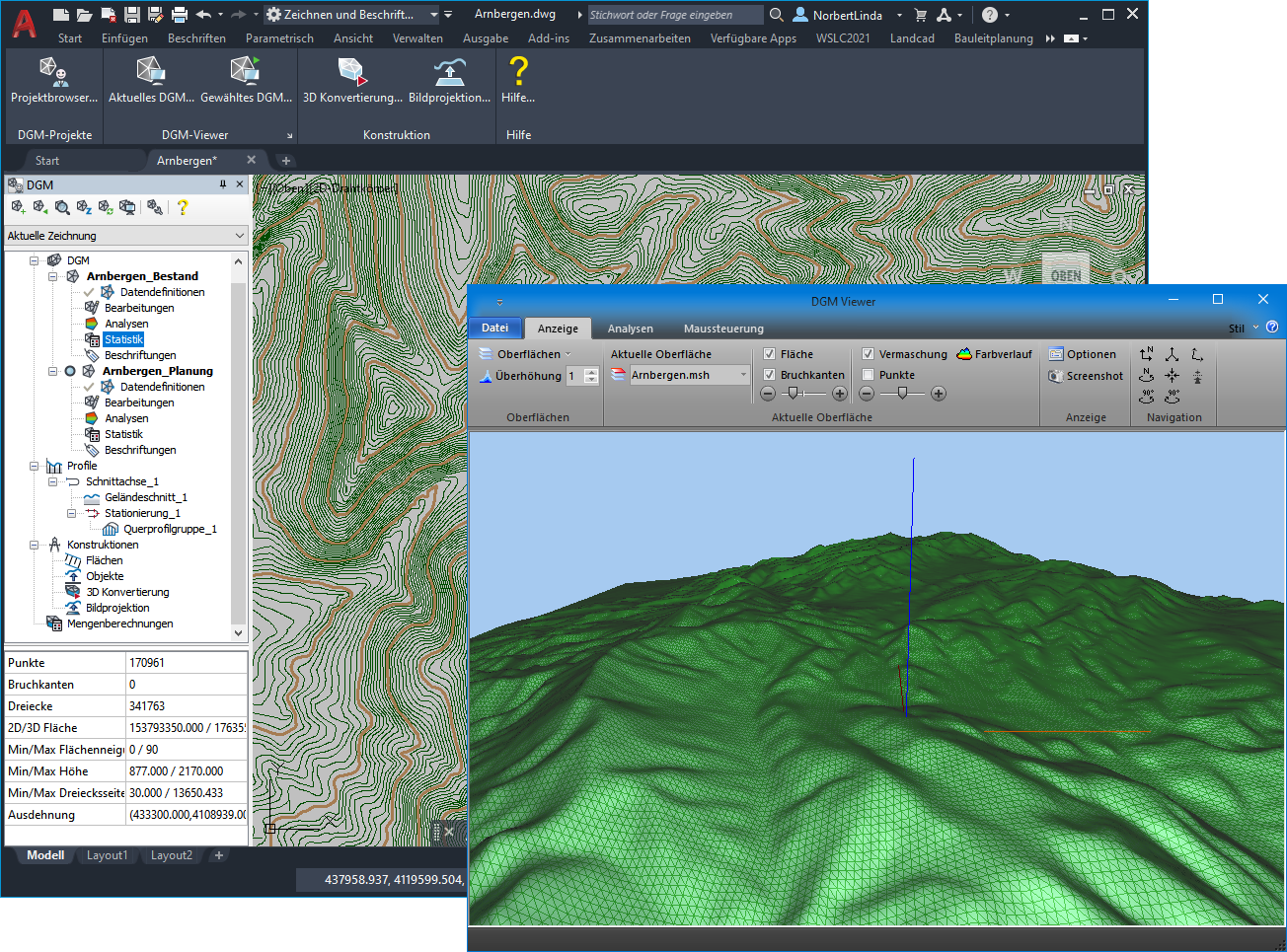 Das DGM ist ein modernes und leistungsfähiges Programm zur Erstellung, Bearbeitung und Auswertung digitaler Geländemodelle. Durch den Import einschlägiger Datengrundlagen und/oder durch die Übernahme vorhandener Zeichnungselemente lassen sich beliebig viele DGM-Flächen innerhalb einer oder mehrerer Zeichnungen bequem erstellen und verwalten. Ein separater DGM-Viewer erlaubt hierbei die optimierte Betrachtung selbst sehr großer Geländemodelle.