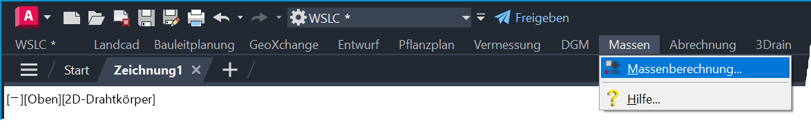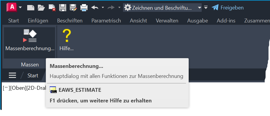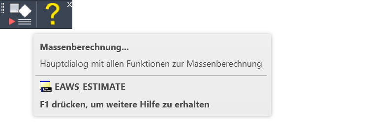 Zur Befehlsauswahl stehen je nach verwendetem CAD-System und verwendeter Konfiguration ein Register in der Multifunktionsleiste, ein Pull-down-Menü und ein Werkzeugkasten zur Verfügung, welche jeweils die gleiche Befehlsstruktur aufweisen. In diesem Modul steht lediglich der Befehl Massenberechnung (EAWS_ESTIMATE) zur Verfügung, welcher den Hauptdialog mit der gesamten Funktionalität beinhaltet.