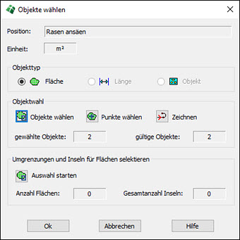 Der Dialog Objekte wählen zeigt Ihnen die geforderte Einheit (hier: m2) und die möglichen Objekttypen an (hier primär Fläche aber auch Länge mit zugeordneter Breite). Sind Fläche und Länge als Objekttyp möglich, sollten Sie nun eine der Möglichkeiten wählen, weil Selektionsvorgänge stets von gleichem Typ sein müssen. Durch Betätigung der Schaltflächen zur jeweils geeigneten Objektauswahl wird der Dialog ausgeblendet und Sie werden zur Selektion aufgefordert. Es werden nun i. d. R. neue Konturen der selektierten Objekte auf dem zugeordneten Konturlayer erzeugt und anschließend zum Dialog Objekte wählen zurückgekehrt, in welchem die Anzahl der gewählten und gültigen Objekte dargestellt werden. Die Objektwahl können Sie nun beliebig oft wiederholen. |