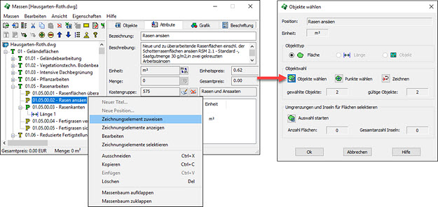 Durch Betätigung des Befehls Zeichnungselement zuweisen wird die Objektwahl eingeleitet.