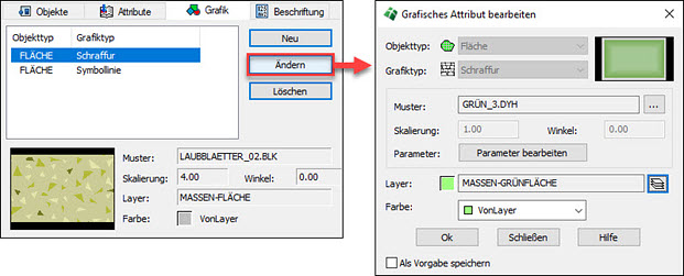Bei einer bereits in der Liste vorhandenen Grafikzuordnung kann der Objekt- und Grafiktyp nicht mehr verändert werden und ist daher ausgegraut. Alle anderen Zuweisungen wie z. B. der Wechsel des Musters und dessen Eigenschaften sind jedoch verfügbar. Soll auch der Objekt- und/oder Grafiktyp verändert werden ist über die Schaltfläche Neu eine neue Zuweisung zu erstellen. Falls gewünscht kann die vorhandene Zuweisung auch gelöscht werden.