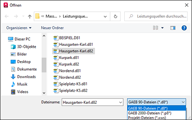 Nach der Auswahl des Import-Befehls mit Hilfe des Import-Icons oder des Befehls Massen → Import... erscheint der übliche Dateidialog, wobei Sie im unteren Bereich zunächst den Dateityp auswählen müssen. Hier steht Ihnen die Auswahl der GAEB-Versionen 90 und 2000 zur Verfügung, welche sich neben dem internen Aufbau i. d. R. auch durch die Dateiendung unterscheiden. durch ein P ersetzt, also P82. |