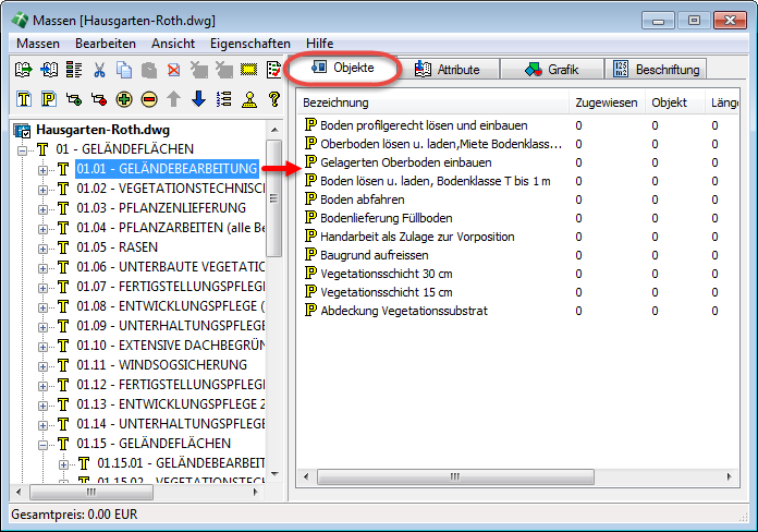 Durch Ausführen des Imports gelangen alle markierten Inhalte in das Positionsfenster auf der linken Seite. Sie können das Importfenster nun schließen und bei Bedarf weitere Quellen importieren. Durch das Schließen wird der erweiterte Dialog mit dem aktivierten Register Objekte angezeigt. Bei einem markierten Titel werden hierbei die darin enthaltenen Positionen aufgelistet. Es handelt sich nun um ein leeres LV, d. h. alle Positionen haben noch keine Mengen. Es wurden noch keinerlei Zeichenelemente als Objekt, Länge, Fläche oder Volumen zugewiesen. Dies ist auch an der Gelbfärbung aller Symbole zu erkennen. |