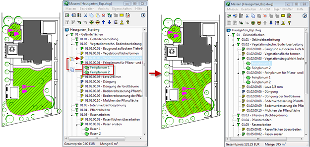 Anmerkung: Es versteht sich von selbst, dass nur solche Objekte eingefügt werden können, deren Objektart (z. B. Fläche) mit den Einheiten der neuen Position konform sind. Es lassen sich daher z. B. keine Flächen in eine Position mit Längen kopieren. |
