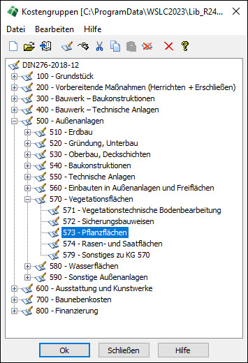 Ein Klick auf das Kostengruppen-Icon öffnet den Dialog Kostengruppen, mit dem Sie eine passende Kostengruppe aus der aktuell geladenen Kostengruppendatei zuordnen können. Die Zuordnung einer Kostengruppe ermöglicht die spätere Ausgabe als Kostenermittlung nach DIN 276. Im Verzeichnis der Kostengruppen \Lib\Massen\Kostengruppen befinden sich bereits mehrere Kostengruppendateien nach DIN 276 (alt, neu und erweitert), welche zu diesem Zweck verwendet oder editiert werden können. |