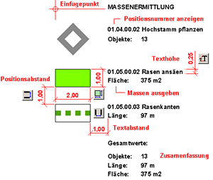Dieser Schalter bewirkt die Ausgabe der Positionsmassen unterhalb der Positionstexte. Des Weiteren wird eine Zusammenfassung aller ermittelten Mengen am unteren Rand der Legende erzeugt. |