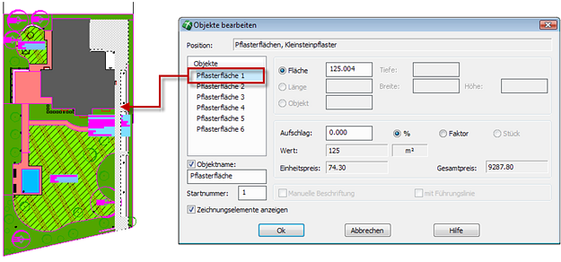 Zur Bearbeitung können nicht nur ein Zeichenobjekt, sondern mehrere oder alle Objekte einer Position im Massenbaum ausgewählt werden. Ist der Schalter "Zeichnungselemente anzeigen" aktiviert, blinkt das jeweils im Bearbeitungsdialog selektierte Objekt inklusive zugeordneter Grafik und kann daher leicht lokalisiert werden. Bearbeitbar sind je nach aktuellem Objekttyp die direkt ermittelten Massenwerte, zugeordnete Werte für Breite und/oder Tiefe sowie Massen-Aufschläge. Ein Objektname kann editiert werden, nachdem Sie in einem vorhandenen Namen klicken. Wurden mehrere Objekte selektiert, können Sie auch alle Objekte und die Startnummer ändern, indem Sie den Schalter Objektname aktivieren und die nun zugänglichen Werte editieren.