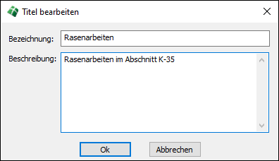 LV bearbeiten Titel bearbeiten Bei der Bearbeitung eines Titels stehen Ihnen die Editierung der Bezeichnung sowie eine optionale Beschreibung zur Verfügung.