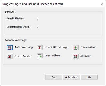 Wird der Schalter Auswahl starten verwendet, öffnet sich die Dialogbox für die Umgrenzungs- und Inselauswahl.