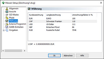 SetupMassen Setup Währung Die zu verwendende Währung kann aus der Liste gewählt werden. Die durch unterschiedliche Währungen veränderten Einheitspreise werden stets aktualisiert und bei einer Ausgabe des LVs berücksichtigt.