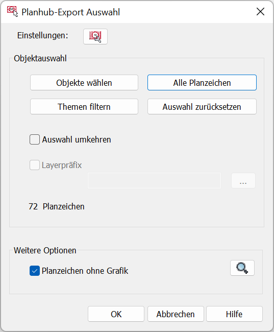 Der Befehl öffnet zunächst den Dialog zu der Planhub-Export-Auswahl, worüber die Planzeichen in der Zeichnung grafisch gewählt werden können.