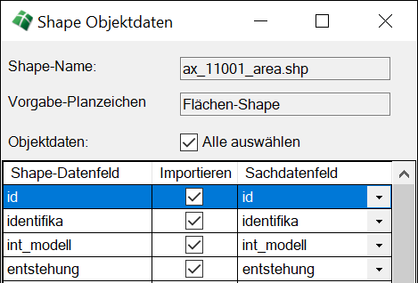 Durch Aktivierung der gepunkteten Schaltfläche (…) wird der Dialog Shape-Objektdaten geöffnet, welcher alle in der DBF-Datei enthaltenen Shape-Datenfelder auflistet und einem Sachdatenfeld für das Planzeichen von WS LANDCAD zuordnet. Die Felder lassen sich beliebig selektieren, wobei der Schalter Alle auswählen eine automatische Selektion/Deselektion aller Datenfelder vornimmt. |