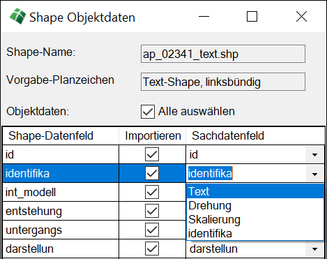 Anmerkung: Das Sachdatenfeld Text sollte nur ein einziges Mal gewählt werden, weil das zur Verfügung stehende Textplanzeichen nur über ein Attribut zum Übernehmen der Textinhalte verfügt. In der Planzeichenbibliothek Planzv90.sqlite befindet es sich im Gliederungspunkt Planzeichen für den Shape-Import und steht in zwei Varianten zur Verfügung. Prinzipiell lassen sich aber auch Textplanzeichen mit mehreren Attributen und dazugehörigen Sachdatenfeldern erstellen und in die Bibliothek einbinden. |