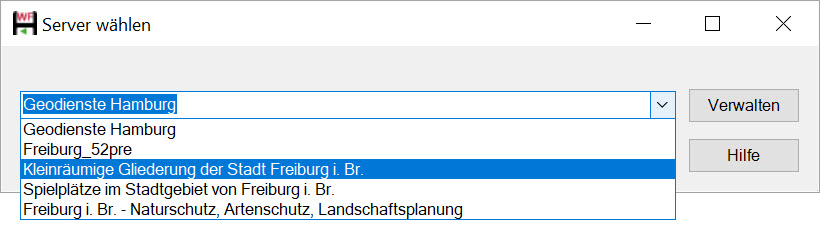 Beim Aufruf des Befehls WFS-Import erscheint zunächst der Dialog Server wählen, in dessen Eingabezeile Sie entweder eine Serveradresse eingeben oder einen benannten Server mit Hilfe einer Klappliste wählen können. Hierbei handelt es sich um einen Internetserver, welcher den jeweiligen WFS-Dienst zur Verfügung stellt. Ein WFS-Dienst ist ein Internet-gestützter Zugriff auf Geodaten, dessen Zeichnungsinformationen auf Vektordaten beruhen. Der Dienst gibt die Daten hierbei im GML-Format zurück.