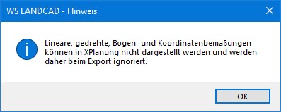 Anmerkungen: Der XPlan-Import legt Objekte der Klasse BP_AbstandsMass auf dem aktuellen Layer und aktuellen Bemaßungsstil ab! Da im XPlan-Standard keine Definitionen für Bogenlängen- und Koordinatenbemaßungen vorliegen, werden entsprechende Bemaßungen beim Export immer ignoriert, ebenso lineare Bemaßungen, die in der Bauleitplanung nicht benötigt werden. Aus gedrehten bzw. weiterführenden Bemaßungen lassen sich keine eindeutigen Bezugspunkte ermitteln, sodass WS LANDCAD auch hierzu eine Warnmeldung ausgibt: