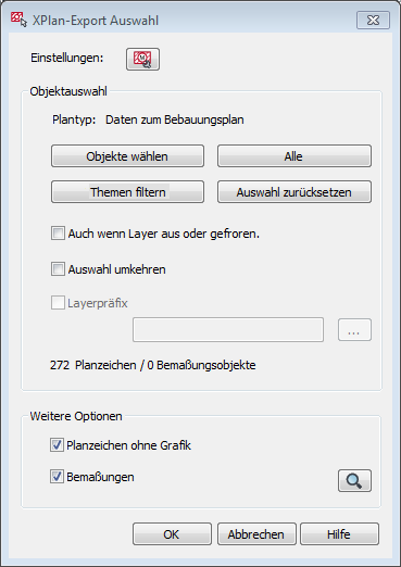 Der XPlan-Export öffnet den Dialog XPlan-Export Auswahl, worüber die Planzeichen in der Zeichnung grafisch gewählt werden können. Da der Exportvorgang durch wichtige Optionen des PlanZV-Setup gesteuert werden kann, bietet der Dialog über die Schaltfläche Einstellungen die Möglichkeit zum Aufruf des PlanZV-Setup. Hier wird dann sofort das Register XPlanung angezeigt.