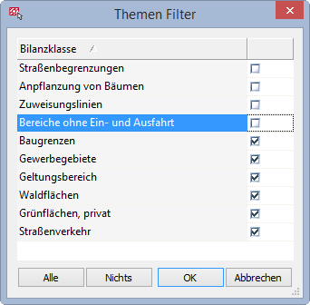 Zunächst sind alle Bilanzklassen der Zeichnung aktiviert. Über Nichts kann man alle Einträge deaktivieren, über Alle wiederum sämtliche Inhalte aktivieren. Über OK verlässt man den Dialog und hat somit einen Themenfilter aktiviert. Abbrechen schließt den Dialog, ohne dass ein Themenfilter verwendet wird. Die Aktivierung eines Themenfilters bedeutet, dass über die Auswahlmethoden Objekte wählen und Alle im Dialog XPlan-Export Auswahl nur Planzeichen gewählt werden können, die den eingestellten Themen bzw. Bilanzklassen entsprechen. |