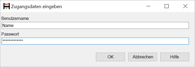 Viele Server, die WFS-Dienste für die Bauleitplanung zur Verfügung stellen, sind öffentlich und erfordern i. d. R. keine Authentifizierung. Falls dennoch eine Authentifizierung erforderlich sein sollte, erscheint die Dialogbox Zugangsdaten eingeben, bevor der Zugriff auf den Server erfolgt. Hier geben Sie bitte den Benutzernamen und das Passwort ein.