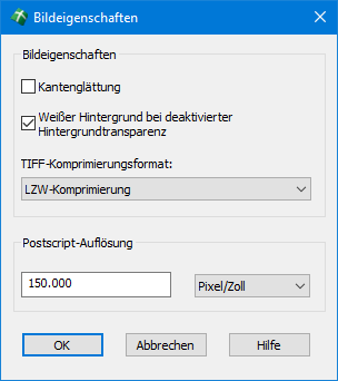 Unter den Bildeigenschaften ist zudem eine Kantenglättung möglich. Die Bildausgabemöglichkeiten in WS LANDCAD basieren technisch auf der PostScript-Ausgabe von AutoCAD und BricsCAD. In AutoCAD ist es leider so, dass vorgabegemäß eine Kantenglättung durchgeführt wird. Für reine Strichzeichnungen und Texte ist das vorteilhaft, Pläne mit Flächenfüllungen erscheinen dadurch jedoch sehr gerastert. Um diese Form der Triangulation im Plotergebnis zu vermeiden, empfiehlt es sich, im Allgemeinen die Kantenglättung zu deaktivieren. Unter BricsCAD kann die Kantenglättung jedoch durchaus zu etwas besseren Resultaten führen.