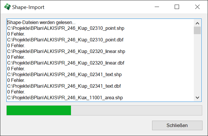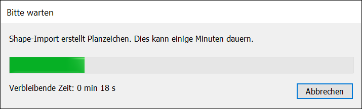 Nachdem der Dialog Shape-Import Konfiguration mit OK beendet wurde, beginnt die eigentliche Umsetzung. Im ersten Schritt werden alle Informationen aus den gewählten Shape-Dateien und der Konfiguration gesammelt und als Planzeichen bzw. grafische Elemente umgesetzt. |