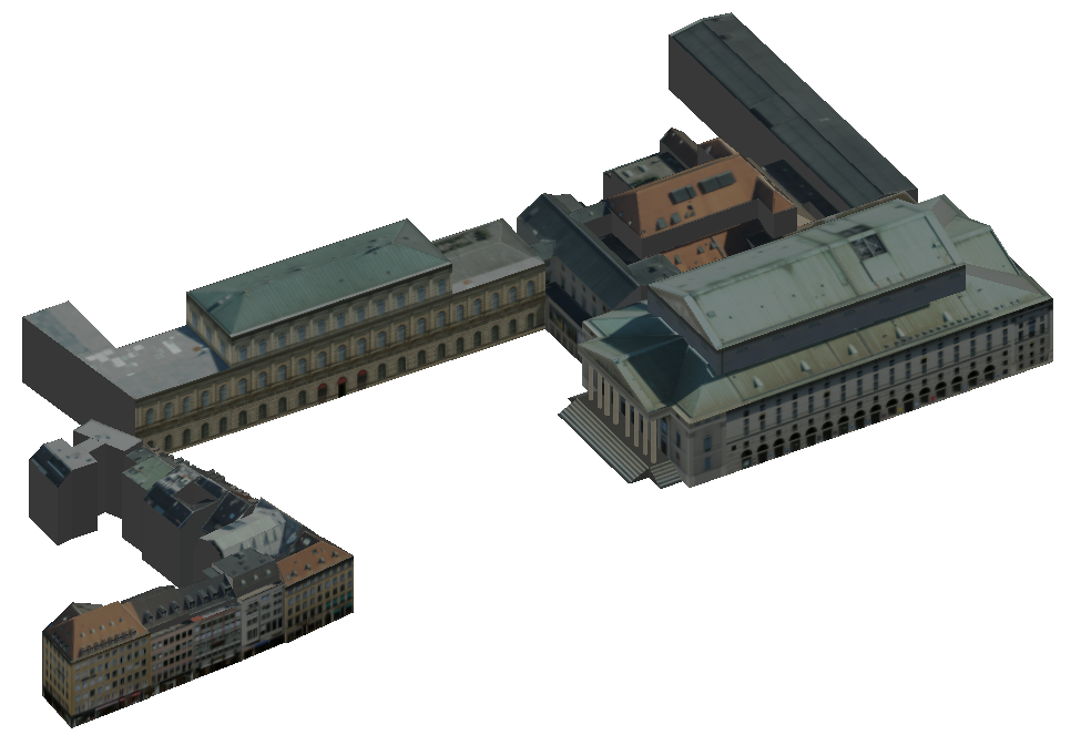 Im Gegensatz zu einer Anzeige im 2D-Drahtkörper erfordert der realistische Stil in umfangreichen Modellen eine hohe Rechenleistung, so dass ein temporäres Umstellen des Anzeigestiles über den Befehl SHADEMODE hilfreich sein kann. Sollte der CityGML-Import mit der Option Texturen verwenden (PlanZV-Setup → Register CityGML) durchgeführt worden sein, sind im realistischen Stil auch Texturen auf den Gebäuden erkennbar. Voraussetzung dafür ist natürlich, dass die Texturen aufgenommen und in den Ordnerstrukturen der CityGML-Daten mitgeliefert wurden.