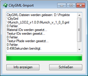 Nach der Bestätigung der Dateiauswahl wird das Protokollfenster CityGML-Import geöffnet, welches zunächst das Einlesen der CityGML-Datei anzeigt. Konnte die Datei fehlerfrei eingelesen werden, erscheint der Konfigurationsdialog, welcher zur Auswahl der Daten und deren Darstellung dient.