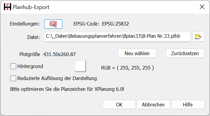 Nachdem die Auswahl der zu exportierenden Planzeichen mit OK bestätigt wurde, erscheint der Dialog Planhub-Export. In diesem kann der Name und der Pfad der zu exportierenden Plhb-Datei festgelegt werden. Zudem wird in der ersten Zeile das in der Zeichnung identifizierte (bzw. nachrangig im Setup bestimmte) Koordinatensystem (EPSG-Code) aufgeführt. Es wird in die exportierte GeoJSON-Datei geschrieben. Um Änderungen vornehmen zu können, kann man unmittelbar in die Einstellungen für den Import-Export im Setup gelangen.