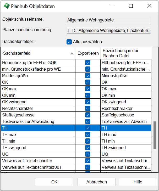 Das exportierte Sachdatenfeld könnte parallel auch von anderen Themen exportiert werden. Eine Umbenennung in der Spalte Bezeichnung in der Planhub-Datei führt automatisch dazu, dass die Bezeichnung auf andere Themen angewandt wird. Ein Beispiel: Das Datenfeld TH soll im Planhub-System mit dem Klarnamen Traufhöhe auftauchen. Wenn neben den Allgemeinen Wohngebieten parallel auch Mischgebiete u. Ä. mit Festsetzungen zu demselben Maß exportiert werden, wird die Umbenennung bei den anderen Inhalten des Planes ebenfalls wirksam.