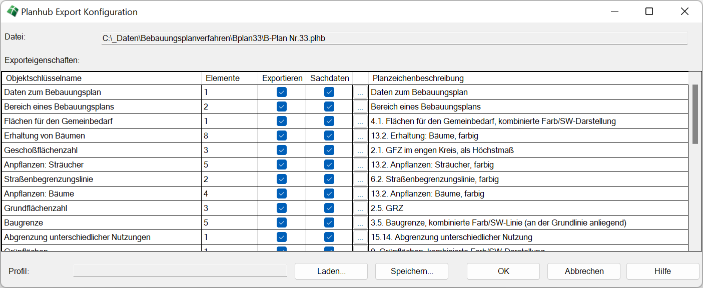 - Sachdaten: Die Sachdaten, die zu den jeweiligen Themen gehören, können vom Export gänzlich ausgeschlossen werden. Im Planhub ist dann nur bekannt, um welches Planzeichen es sich handelt. Das Häkchen kann nur aktiviert werden, wenn die Checkbox bei Exportieren in der jeweiligen Zeile aktiv ist.