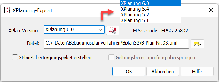 Versionswahl für den XPlanung-Export