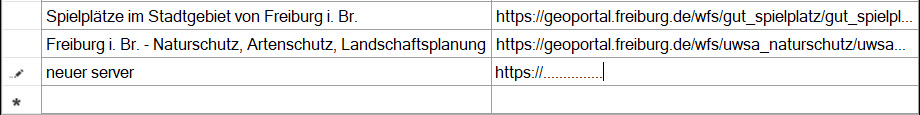 Die Serverliste listet alle aktuell eingerichteten Serveradressen auf, unter denen der jeweilige WFS-Dienst verfügbar ist. Zur Adresse kann ein Alias vergeben werden. Der Alias ist eine manuell vergebbare Bezeichnung, unter welcher der Server in der Klappliste der Dialogbox Server wählen erscheint. Wird kein Alias vergeben, erscheint stattdessen die gesamte Serveradresse in der Auswahl.