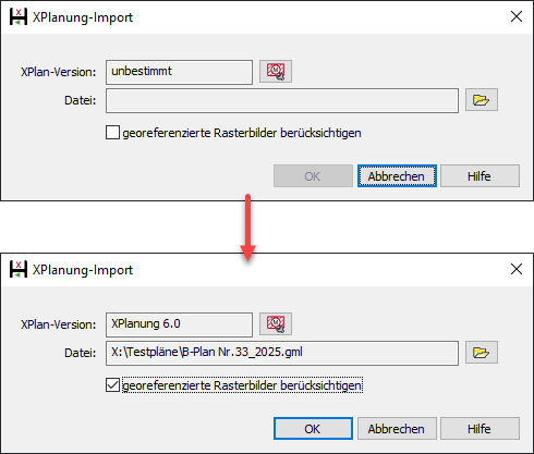 - Über die Auswahl von georeferenzierte Rasterbilder berücksichtigen können Rasterbilder, die im importierenden Plan als entsprechende Referenz hinterlegt wurden und sich im gleichen Ordner bzw. Zip-Archiv wie die einzuladende GML befinden, beim Import von WS LANDCAD berücksichtigt werden. Sie werden anschließend in der Zeichnung angezeigt. Einstellungen zum Verhalten des importierten Rasterbildes, finden sich im Setup des Bauleitplanungsmodules.