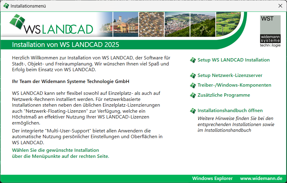 Nach dem Öffnen des WS LANDCAD-Installationsmediums müssen Sie i. d. R. unter Microsoft Windows 10/11 zunächst die Ausführung des Startmenüs bestätigen und, falls Sie als Standard-Benutzer angemeldet sind, ein Administrator-Passwort eingeben. Durch das Anklicken eines Eintrages gelangen Sie auf die Folgeseite, welche spezifische Hinweise sowie die Auswahl des jeweiligen Setups beinhaltet.