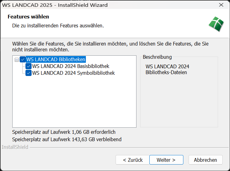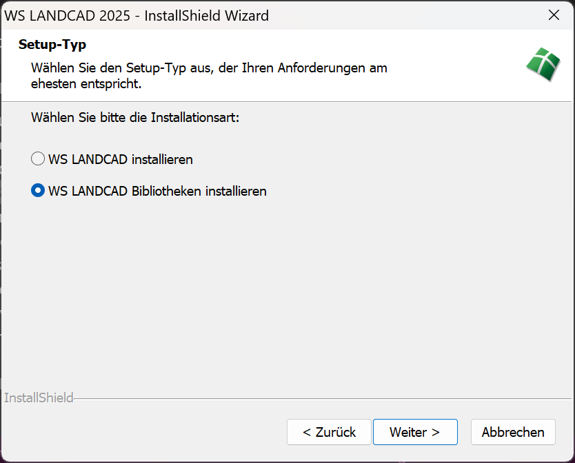 Achtung: Sie sollten die WS LANDCAD-Bibliotheken separat installieren, wenn eine gemeinsame Nutzung der Bibliothek gewünscht wird. Dies verhindert, dass durch die Deinstallation auf einem Arbeitsplatz ggf. die zentrale Bibliothek ebenfalls deinstalliert wird. |