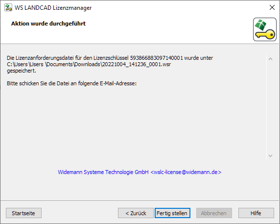 Die Lizenzanforderungsdatei können Sie dann als E-Mail-Anhang an einem Rechner mit funktionierendem E-Mail-Account an die Adresse wslc-license@widemann.de verschicken.